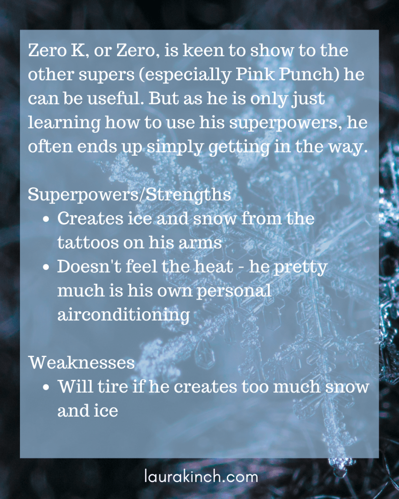 Zero K, or Zero, is keen to show to the other supers (especially Pink Punch) he can be useful. But as he is only just learning how to use his superpowers, he often ends up simply getting in the way.